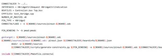 CONNECTALFLAGS, PIN_BINDING, gentarget: estas tres variables de archivo make se utilizan para conectar los cables suplementarios a los pines del dispositivo FPGA (que a su vez conectan con los cables del PMod en el zedboard). Les hablaremos más extensamente al examinar cómo especificar el pinout para el proyecto.