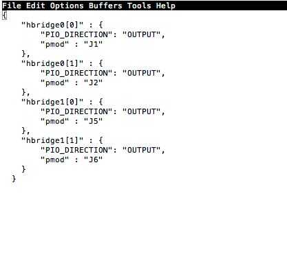 hbridge_simple exporta una interfaz pernos adicionales. Es necesario especificar cómo conectar estas señales a los pins de físicos. Falta especificar completamente este pinout resultará en un error de compilación (Vivado emite una advertencia durante la fase de enlace y no en la fase final bitgen). Hemos especificado la asignación en pinout.jason, que asocia un nombre en el Verilog generado a un pin en el archivo boardinfo. Porque muchos de los conectores son algo modulares, nos ha parecido útil añadir un nivel de indirección entre los nombres de grupo usada en los nombres de archivo y grupo de pines definidos en el archivo boardinfo. En pinout.json, se puede ver que estamos usando pins J1, J2, J5 y J6 en grupo "pmod". Porque el grupo "pmod" no existe en el archivo de información de la Junta, especificamos PIN_BINDING en el Makefile para indicar el conector PMOD real que estamos enchufados. Podría apenas como fácilmente ha especificado "pmodc" directamente en pinout.json, pero utilizando esta asignación nos entregamos mayor flexibilidad si queremos alguna vez conectar el hbridges a un conector pmod diferentes.