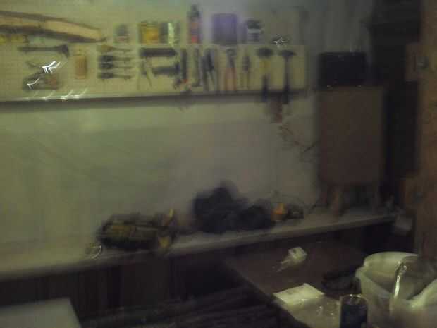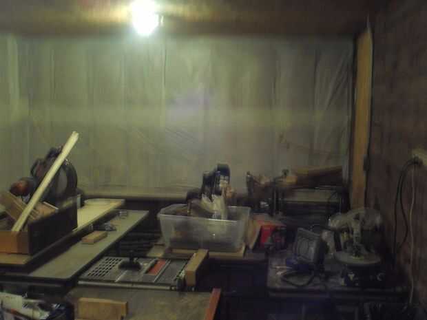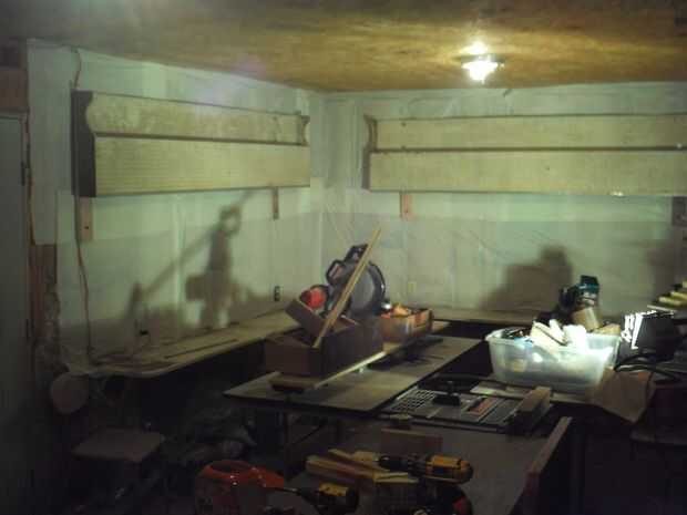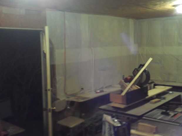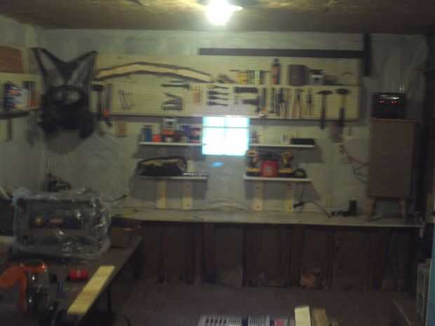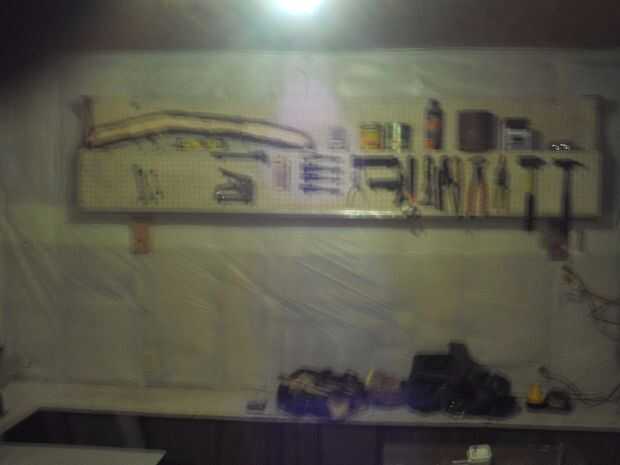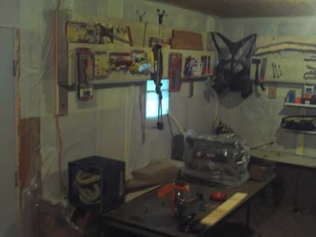 Esta habitación necesita muchos cambios y debía hacerse sin ningún cambio de bolsillo de sobra. Tenía acceso libre a algunos plástico blanco cubre mesa disponible. He visto esto serviría una doble, propósito, mantener el aislamiento de la pared, (que también ayuda a aislar la habitación) y dos, la blanca pared definitivamente ayudaría a iluminar la habitación. Luego hay los tableros prefabricadas que son 10 pies de largo. Sabía que tenía que haber una manera de utilizarlos, incluso sin tener ningún suspensiones pegboard. He usado clavos de techar en cambio, parecen trabajar muy eficientemente. También, un poco de colocación de herramientas grande, para hacer la tienda más funcional.