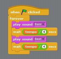 1) en el otro "cuando haga clic la bandera" hay un bloque para siempre con dos comandos de sonido de juego y espera comandos. Haga clic en el bloque de sonido del juego e inserte su propio bajo y ritmos.
