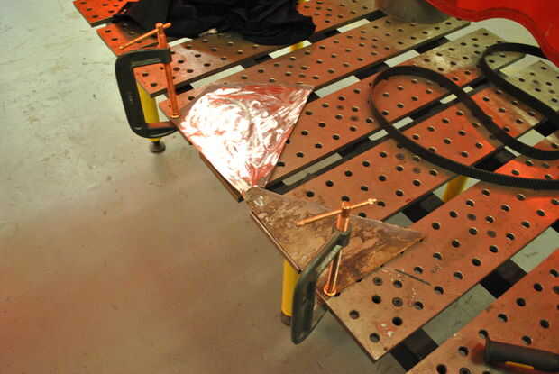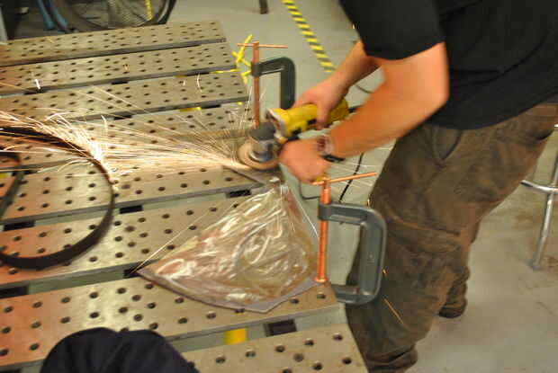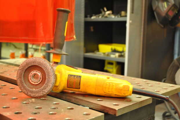 De la abrazadera hacia abajo de la pieza de metal que usted elija y moler! Asegúrese de tener cuidado de acumulación de calor, sobre todo con material de calibre más fino. Es definitivamente posible no sólo para quemar el metal pero también moler a través de él. Usted quiere asegurarse de que el metal es molido abajo lo suficiente para crear puntuación coherente, así como iluminar la superficie para llevar a cabo los aspectos más destacados. En la imagen puede ver fácilmente el antes y después de este pedazo de chatarra que encontré.