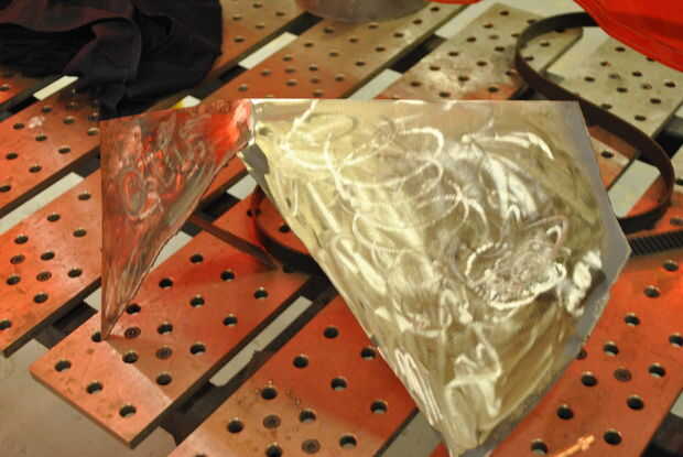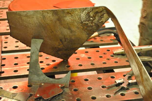 Señalé las quemaduras que habían quedadas desde el calor de la soldadura de las dos piezas de metal juntas. Estas son las quemaduras que marcaron mi última imagen, y así que construí este primero. Como subtítulos, la rueda de la aleta arreglar eso quemadura derecha.