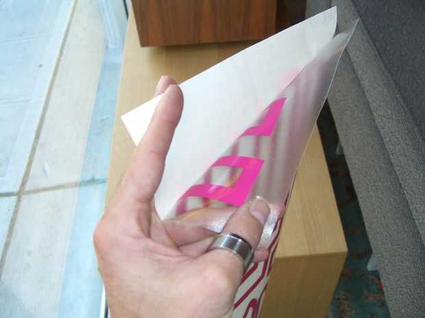 Algunos de los gráficos más complicados pueden ser persistentes, y el vinilo no liberarse tan fácilmente el blanco papel del forro en la cinta de transferencia claro. Cuando esto sucede, no flipar! Dejar de pelar y retroceder un poco y vuelva a intentarlo. Puede que necesite pliegue el blanco donde el vinilo no es liberadora para persuadir el vinilo de papel del forro. Vea nuestras páginas de ayuda en línea de imágenes. La clave del éxito es ir lento.