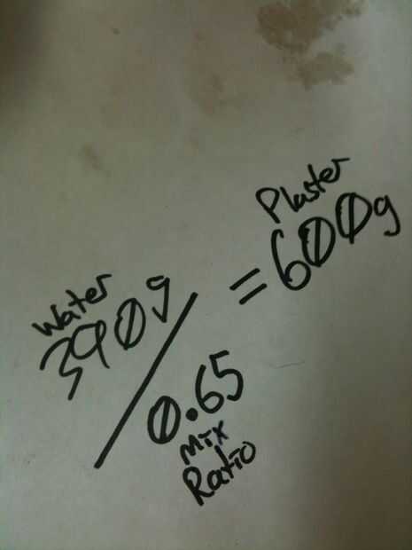 Yeso a menudo se mezcla en una proporción de 65 partes de agua y yeso de 100 partes por peso. Por lo tanto, averiguar yeso requiere sólo Divida su peso de agua por 0,65 y anote este número también. Ver foto mostrando mis matemáticas. El ejemplo utiliza las pesas métricas, pesos sin embargo imperiales funcionan de la misma, su número será menor.