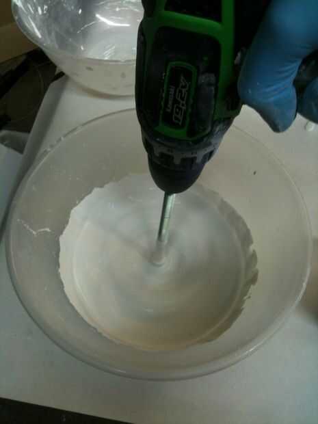 Nota final matemáticas y recto a la mezcla. Ahora necesita dividir el agua y yeso uniformemente en dos como va vertiendo dos veces con el tiempo entre cada uno.
