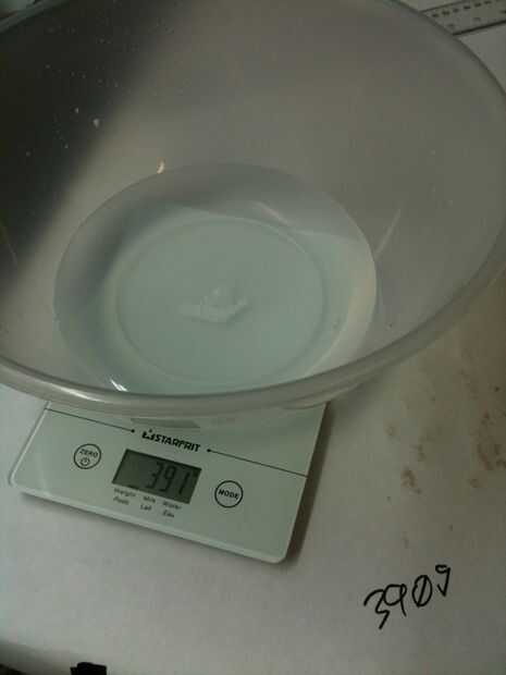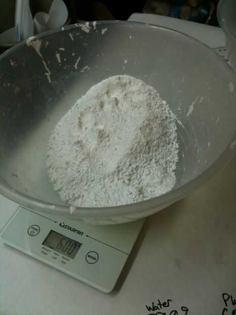 Si se mezcla el yeso y agua por peso, como se describe abajo, luego coloque un recipiente vacío en una balanza de cocina, cero y vierta el agua en él. Anote este número.