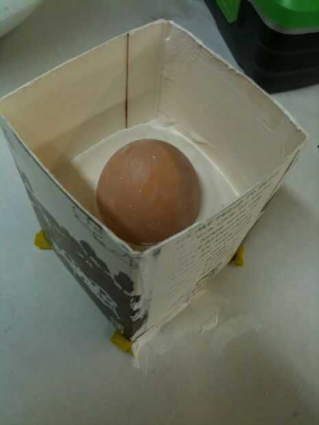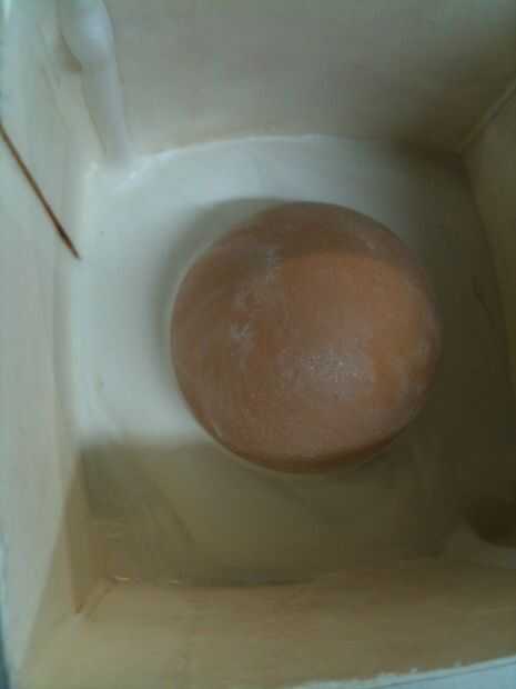 Vierta la mezcla toda en el molde. Golpee el molde contra la mesa unas cuantas veces a incluso hacia fuera y ayuda liberación de aire atrapado. Cuando el yeso empieza a gruesa, colocar el huevo en el centro. Para el lugar de velas con la parte inferior hacia abajo. Coloque la parte superior del huevo hacia abajo para otras fundiciones. Que empujar tan lejos como la marca que hicimos en el huevo. Esto dejará un borde pequeño alrededor del huevo, y eso es lo que queremos.