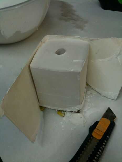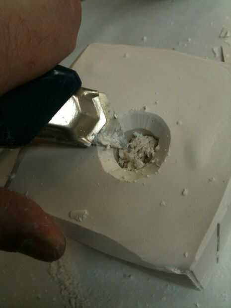 Ahora, cuando está todavía húmedo puede limpiar los bordes con el cuchillo. Surco de la abertura donde el tubo fue hacer un pequeño embudo. Esto es donde va a poner cualquier material que son de fundición. Ver foto.