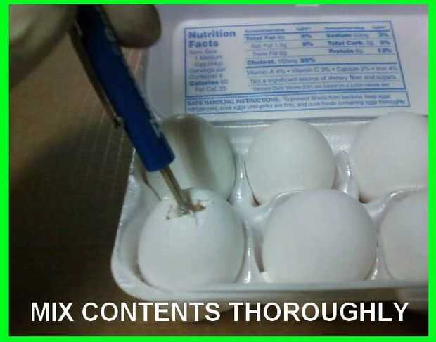Dentro del huevo es la yema y el blanco, pero también hay una membrana entre el líquido y la cáscara. Entre la membrana y la cáscara es un pequeño bolsillo de aire. Utilice el destornillador para mezclar los contenidos. Agitación, se perfore la membrana, el aire interno buscará entonces escapar dejándote espacio para añadir el ingrediente necesario.
