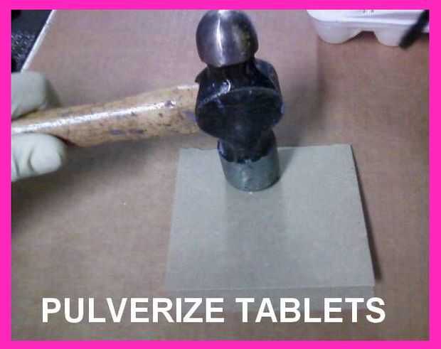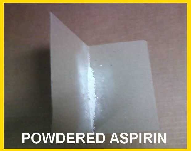 Doblar la cartulina sobre la aspirina y usar el martillo para pulverizar las pastillas en polvo.