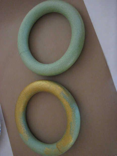 Estos anillos de espuma de poliestireno verde hacen vendas de boda perfectos. Pintar con pintura acrílica oro y están listos para ser lanzados en un dedo.