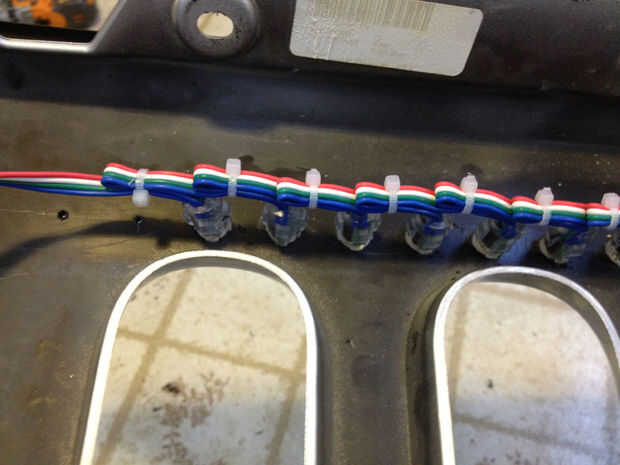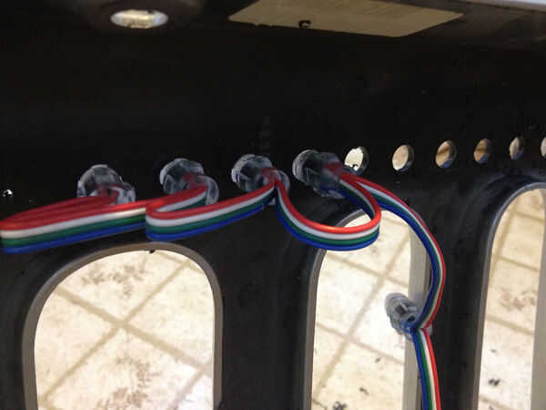 Con 12' de cable de 4 conductores y el par de conectores macho y hembra, hice una extensión TCL. Entonces esto alimenta a través de uno de los puertos convenientes de Jeep en el firewall de compartimiento de motor y en el compartimiento de pasajeros. Entonces asegurado abajo el cable con abrazaderas de plástico.