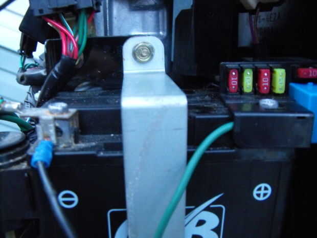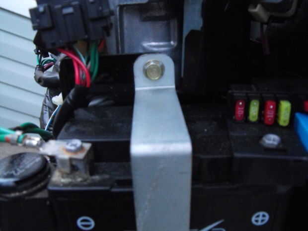 2: Quite el tornillo en el terminal positivo de la batería y levantar con cuidado la caja de fusibles. No tiene mucho juego, y sólo necesita ser capaz de llegar al final desnudo de su positivo alrededor del tornillo terminal, para no forzarlo, solo Levante. También hay una pequeña pieza de metal por debajo de la caja de fusibles que se suelta después de retira el tornillo, trate de no moverlo, si lo hace aunque sólo diapositiva vuelva y asegurarse de que quede alineado con el agujero en el terminal.
