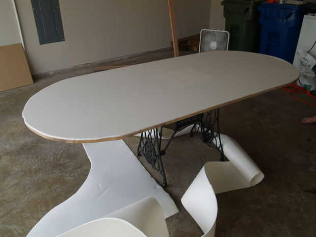 mi esposo y yo somos fans de poker grande. Nuestra mesa estaba envejeciendo y no ve bien en todos. Desde entonces estaba aún robusto y de gran tamaño, decidimos convertirla en una mesa de póquer permanente.Nuestro primer intento (cuadros demostrados)