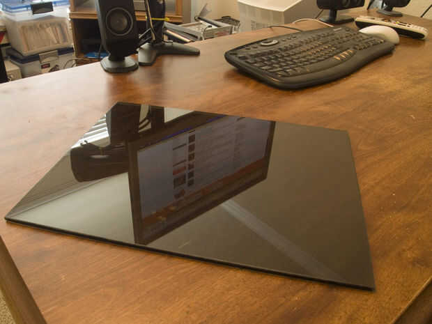 Después de conseguir las medidas, desprendió un trozo de 1/4 de espesor templado vidrio ahumado gris para cerca de $15. Los bordes eran lijar para quitar cualquier borde filoso fieltro-poniendo en peligro.