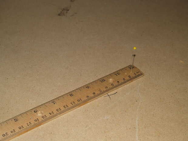 Para ello, tomamos una regla de madera y en un extremo había perforado un palillo pin a través de él, y a medio camino abajo perforó un agujero justo lo suficientemente grande para el final de un marcador. Este es nuestro arco-maker-thingy de alta tecnología.