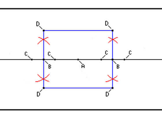 4.) medir a partir de los puntos de borde de dos y hacer dos marcas adicionales, Puntos C y C. Es muy importante que estas dos marcas exactamente la misma distancia del Punto B.
