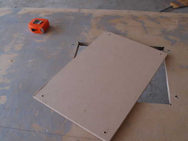 Después tuvimos el estante, había alineado sobre la abertura y aproximadamente centrada en lo, después había perforado los agujeros cerca de las cuatro esquinas a través de la plataforma y la mesa al mismo tiempo. Así, los orificios se alineen correctamente en sin muchos aspavientos.