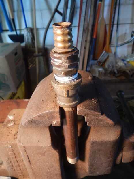 Usted necesitará sostener firmemente el conector hembra. Las fpictures show un accesorio (o plantilla) uno hizo con algunas piezas de fontanería. Sujetar el aparato y el conector en un tornillo de banco como en la primera foto. Entonces coloque la manija sobre el conector hembra y trate de forzar sobre. Si se han ampliado lo suficiente te menos serán capaces de iniciar (si no copia de seguridad de un paso). Se necesita aplicar calor y quizás utilizar el mazo para obtener sobre el conector. Deja que se enfríe y retire el asa. Si usted no puede conseguir usar calor otra vez.