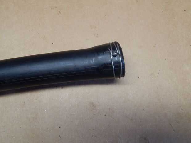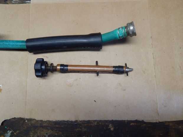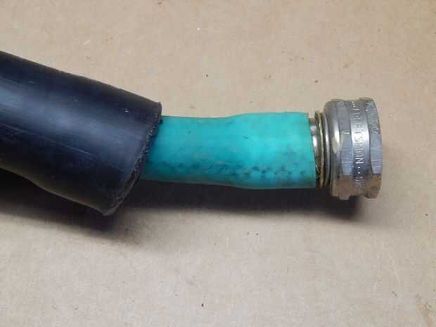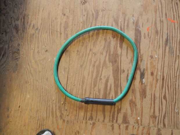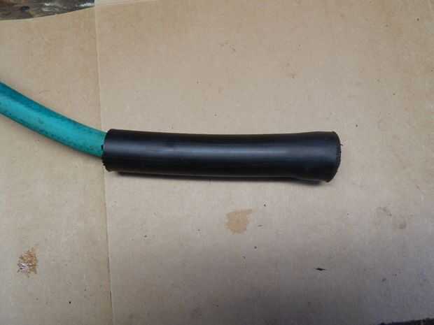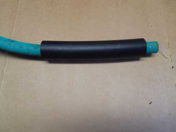 Deslice la manija sobre la manguera mientras que al menos uno de los extremos no tiene ningún conector (si te inscribes el mango a una manguera existente tienes que quitar uno de los conectores. Utilice una abrazadera de cable en el conector hembra (como en gran, fácil y barata reparación de manguera para el jardín y en otros lugares). La abrazadera debe ser lo suficientemente compacta como para que la manija montar sobre él. Fuerza la manija en su lugar. A continuación, abrazadera en lugar con 2 Gire la abrazadera de alambre (en lugar de los 4 habituales, esto es por lo que es estrecho bastante para la parte giratoria de la conexión). Sin esta pinza la manija se deslizará en el accesorio cuando. Cubrir con cinta adhesiva y se acabó. La última fotografía muestra el tubo montado y conectado a sí mismo por ninguna razón particular.