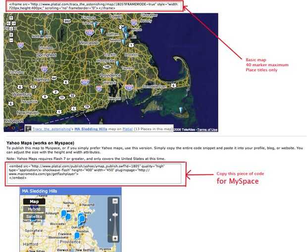 El mapa de Yahoo en la parte inferior se puede utilizar en MySpace. Es la única versión del mapa Platial que trabajará en Myspace. Sólo copia el código e insertarla en tu página de Perfil de MySpace.
