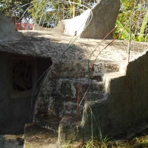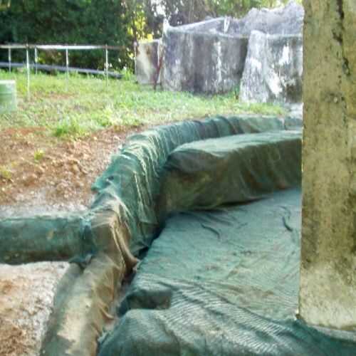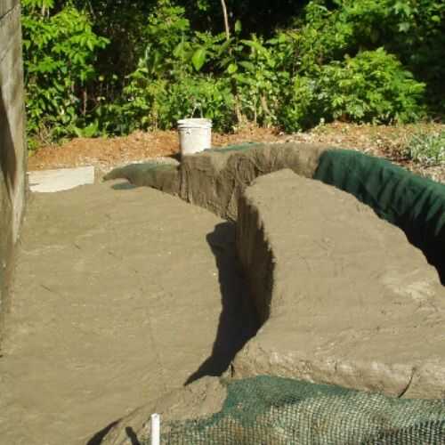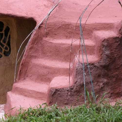Ya estaba agotando en mallas de nylon, utilicé la técnica tradicional de ferro-cemento para la escalera y el techo de la caseta. He utilizado el estándar tres capas de alambre de pollo sobre la varilla, en lugar de una utilizar una sola capa de mallas. Es más trabajo, y la asistencia de otra persona a veces es necesario ayudar a puré abajo de las capas y pasar los alambres de atadura a través de un lado a otro. Cemento de nylon es mucho más fácil de usar y se puede hacer solo.