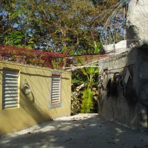 Este diseño requiere de dos o tres árboles (o ramas) en proximidad cercana. Se realizó a lo largo de varios fines de semana con madera nueva, tratada a presión para la estructura de soporte y el piso y una valla fue reciclada para los lados. El techo