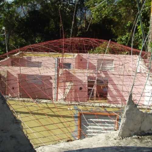 Las paredes de bloque de cemento de la casa tenían talonarios de varilla sobresale.  Los talones se inclinó sobre algunas de las vigas del techo para ayudar a anclar el antiguo techo a las paredes.