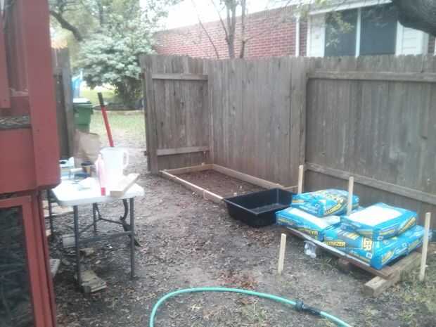 El hormigón es muy pesado y obliga el marco para subir hacia los lados e incluso directamente como viertes, así que necesitarás para la estructura firmemente al suelo. Apenas corté los extremos de algunos restos 1x2s en juego-como formas. Después de que el marco quede nivelado, libra las estacas en el suelo contra el marco y fijar al chasis con tornillos o clavos.