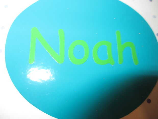 Había hecho los componentes de la etiqueta para cada niño ' nombre en la tienda de tecnología http://www.techshop.com con la cubierta de vinilo. Elegí una fuente fácil (Comic Sans) de Corel Draw y también había hecho óvalos. La tienda de tecnología tiene una buena variedad de colores de vinilo a la venta allí mismo por un precio razonable. Una vez que los nombres fueron cortados por la máquina, he quitado el exceso de vinilo y usa cinta adhesiva para mantener el espacio del nombre. Os adjunto el nombre a los óvalos. Los niños consideran la etiqueta de nombre para ser la mejor parte de la cubierta.