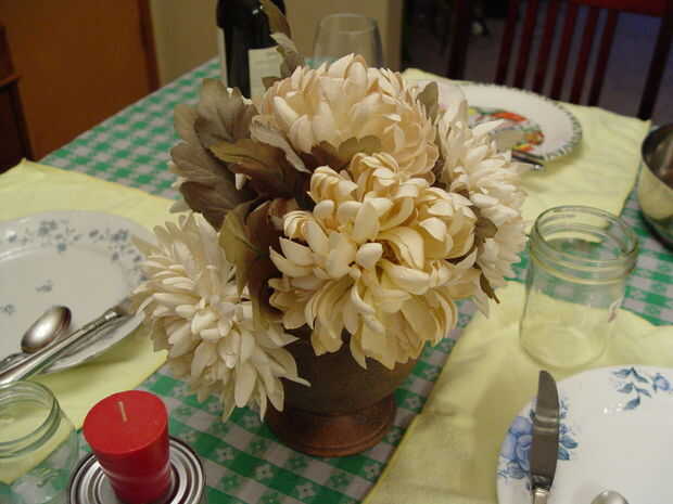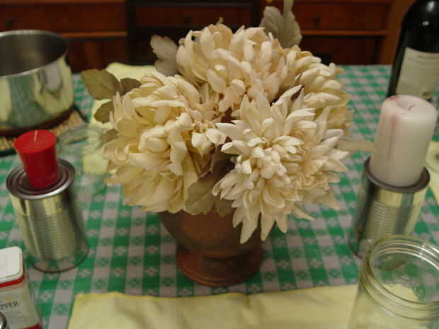 Hay muchas maneras que usted podría ir, pero me encontré con este precioso, si algo en mal estado, maceta de flores en un cubo en la tienda Outlet de buena voluntad. Es donde también encontré mi muy funcional, aunque un poco usado, plástico mantel (es increíble para mí qué grandes cosas algunas personas solo se tire a la basura!) Todo esto fue tenido por el asequible precio de $1,59 libra.