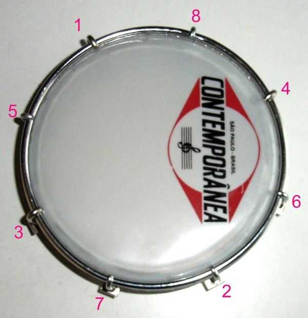Siempre, apriete las tuercas opuestas juntos y (vea ajuste de plan de abajo). Apriete uniformemente para que la piel se estira a una tensión incluso completamente redondo.