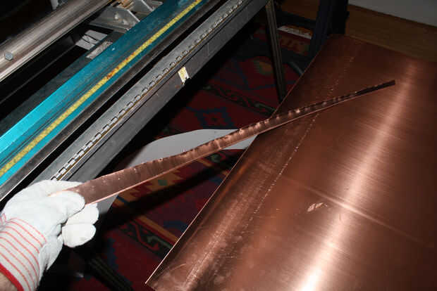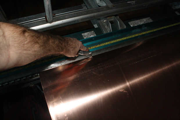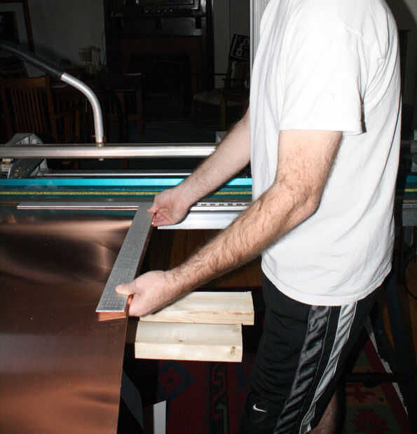 Que significó que tuve que cortar ~ 46". El corte era demasiado largo para utilizar el freno, así que tuve que cortar con las tijeras, que dejó un borde dentado. Para enderezar hacia fuera, ponga el borde dentado en el freno y cortar con la razor blade(s). Anotar el cobre a lo largo del borde del freno con la maquinilla de afeitar y luego usar el freno para doblar y quite el cobre. Esto resultará en un borde limpio agradable. El freno es un trabajo de dos personas para que mi fotógrafo no podía tomar una foto del freno en la acción.