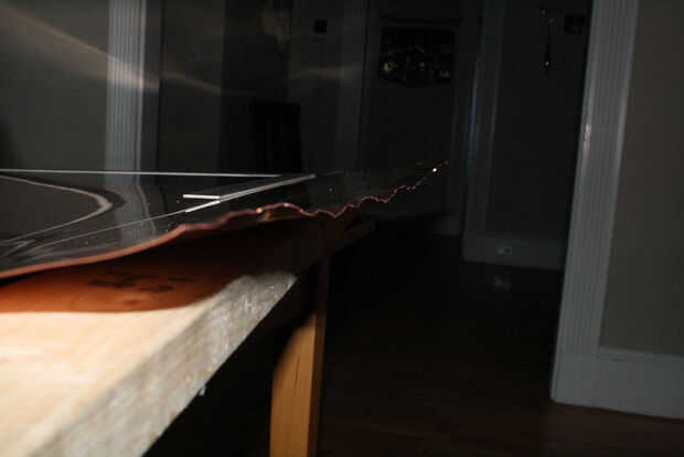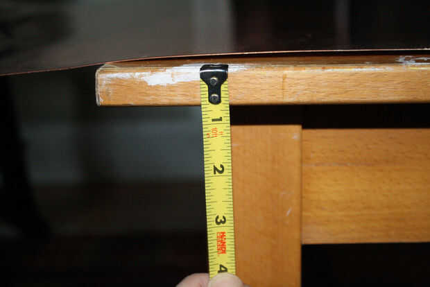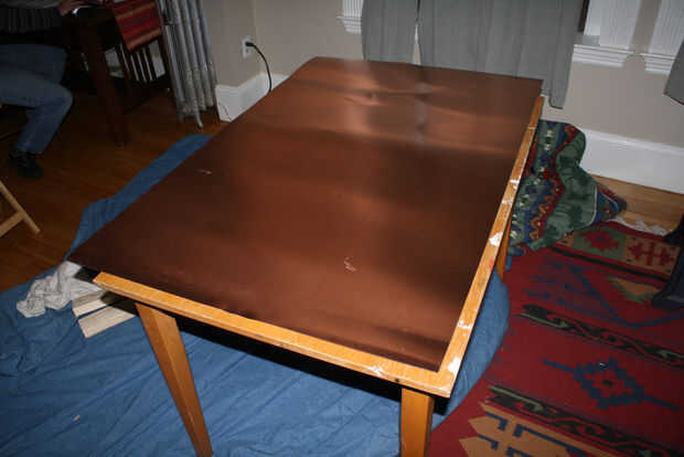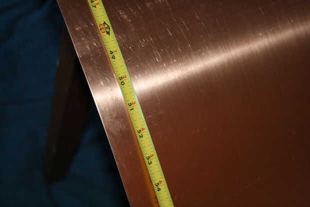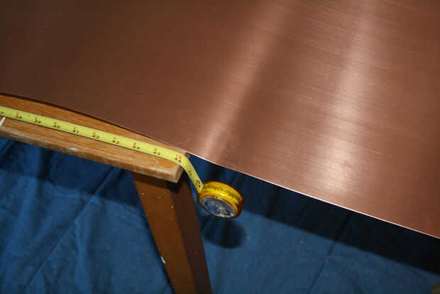 Si es necesario, hacer lo mismo con el borde largo para que tenga una lámina de cobre que sobresale debajo de la mesa por unas pulgadas en todos los lados.