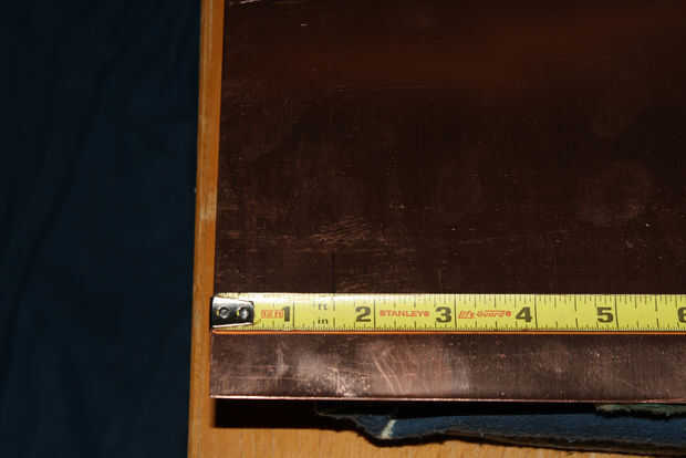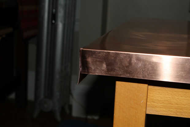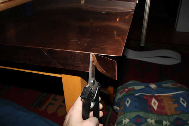 Cuando haya terminado debe tener el cobre doblado en una plaza baja, U que encaje perfectamente sobre la mesa. Para doblar los extremos tendrás que primero cortar 4 cuadrados de cobre. Luego inserte los extremos en el freno y doblarlas. Deberás acabar con los bordes que parecen la última foto.