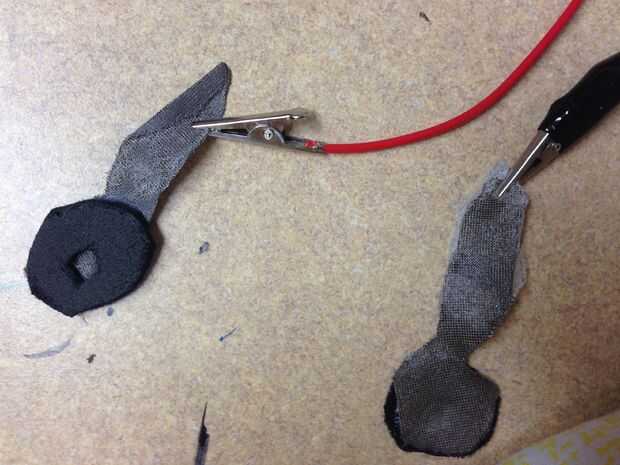 Con hilo normal, coser dos pedazos juntos, con tela conductora en el exterior para que no toquen.