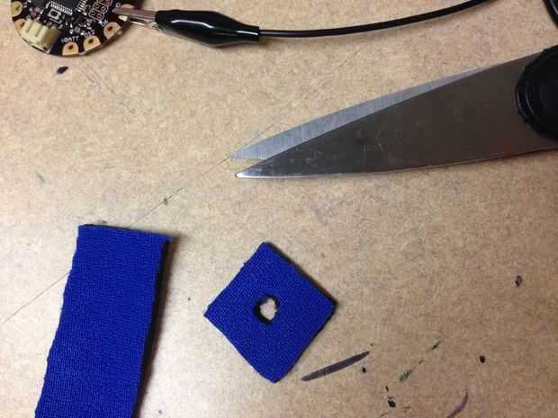 Para hacer mi pulsador, usé sobras de sobras de mi sensor de curva. Yo corte dos cuadrados de material de manga de rodilla sobra y corte agujeros de tamaño de punta de los dedos en el centro de cada cuadrado.