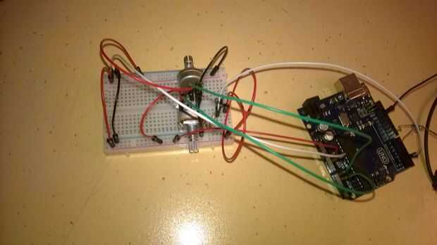 Cada potenciómetro debe tener 3 pines. El medio uno tiene que conectarse a A0 o A1 en su Arduino. Uno de los pernos laterales (no importa cual) debe conectarse a + 5V y el otro a GND. Usted puede encontrar un completo diagrama de Fritzing y algunas imágenes anteriores. Puede comprobarlo una vez más si desea utilizando un ejemplo desde el IDE de Arduino (archivo > ejemplos > analógicas > AnalogInput)