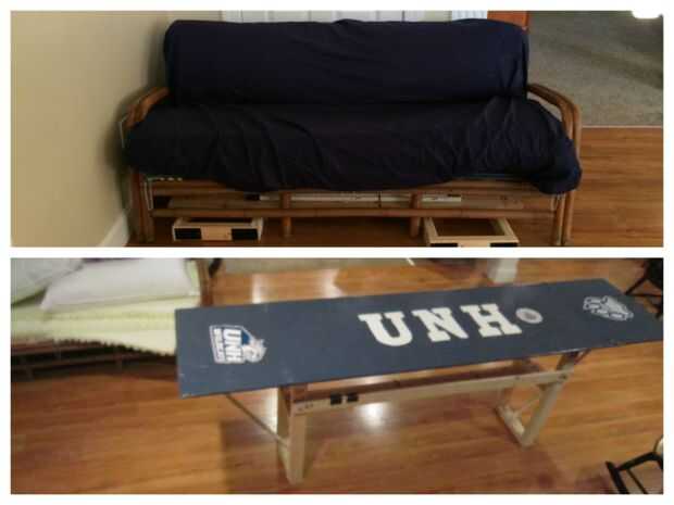 La tabla se compone de tres secciones, las dos exteriores secciones plegables hacia fuera de la sección media para formar la tabla de tamaño completo. La tabla funciona como parte de la cama. La cama y la mesa el mismo par de patas, las patas es de altura de la mesa se levantó y cuando puso a su lado, actúan como las patas de la cama. Si sólo se quería el sofá entonces la madera se dobla para arriba en el sofá y las piernas son deslizadas por debajo de la cama. Los cojines de entonces apenas doblan para el tamaño regular del sofá.