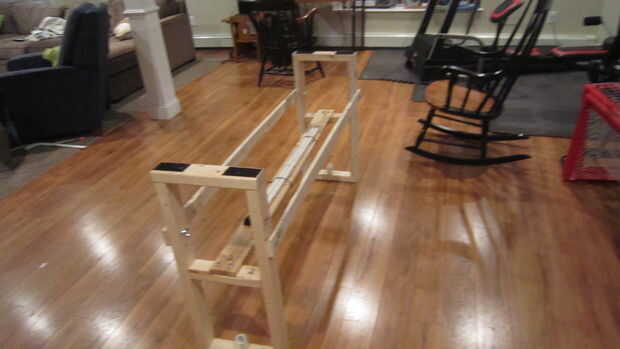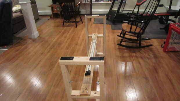 Cortar el soporte del centro y 4 3/8 "x 3" para fijarlo a las piernas. Taladro 3/8" agujeros en el soporte y las patas, 2 agujeros en cada lado. Deslice los pernos a través y fijar con las tuercas de mariposa.