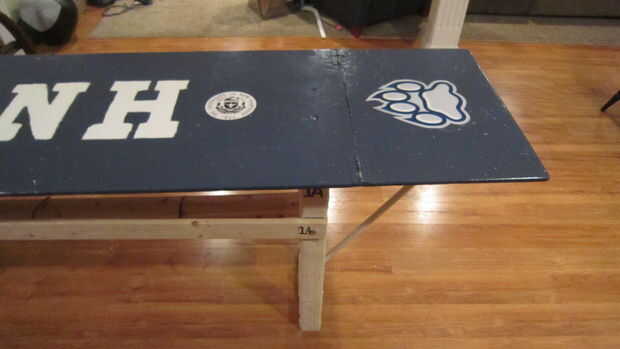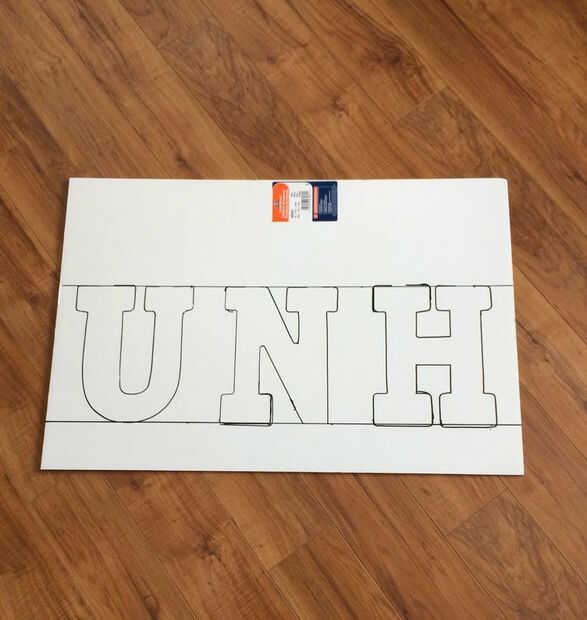 Hice el 'UNH' usando el tablero de la espuma, traza las letras en el tablero de la espuma y recorto con una navaja. Cinta de la Junta a la mesa y rellenar con el color. Hice 3 capas de blanco para las letras, todo dejar secar y luego quitar la cartulina y retocar los bordes de las letras.