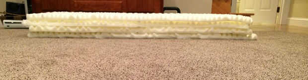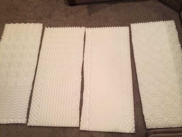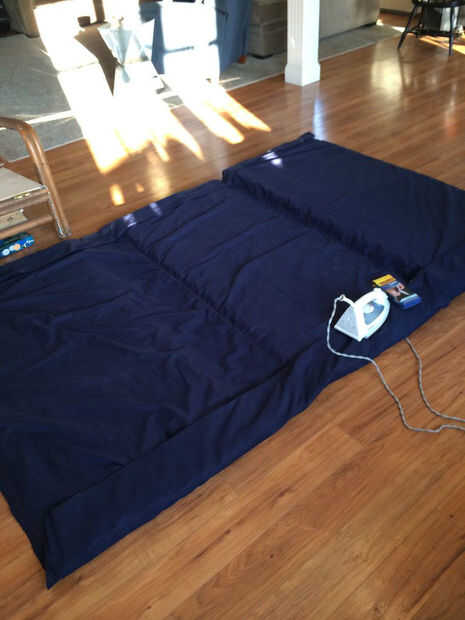 Pegar dos de las secciones de espuma con adhesivo en aerosol. Ahora debe haber 3 secciones total. Coser juntos las dos hojas para que la espuma se pueden deslizar en cada sección pero deje ambos extremos abiertos para que la espuma se puede sacar cuando sea necesario. La sección de espuma de doble debe estar en el final. Las hojas se deben dividir en 3 secciones ahora.