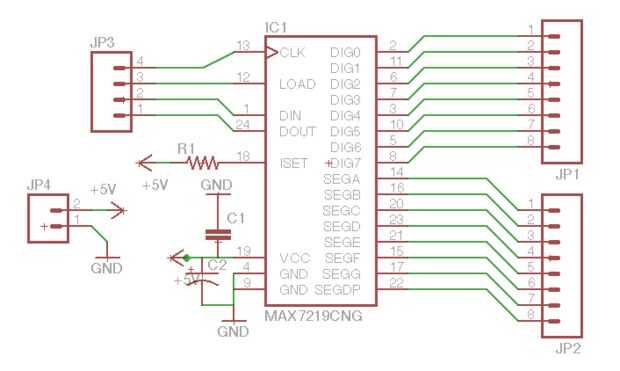 Ahora el IC tiene que conectarse a cada matriz usando el circuito correcto. Diseñé una sencillo breakout Junta para este IC. Yo no soy un ingeniero eléctrico, pero el esquema que ves en las fotos es más o menos lo que entendí de esta página . No muy complicado. Esto hice en Eagle y han subido mis archivos Junta y esquema para usted. Básicamente son encabezados por los pines de comunicación y por los pines de salida que van a la matriz. Hay 2 condensadores de la potencia de entrada y una resistencia que se establece la corriente de los LEDs. Usé una resistencia de 1K para mi aplicación que funcionaba bien.