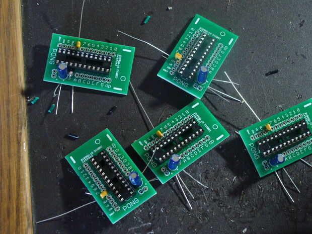 Ahora soldar estos componentes en romper el tablero. Este es un paso muy sencillo. Sólo tienes que asegúrate de poner correctamente el condensador electrolítico polarizado en y alinee la muesca en el zócalo del IC con la muesca en la serigrafía del PCB. Ver las fotos del paso de soldadura. Cuando se realiza soldadura, puede insertar el MAX7219CNG ahora o esperar hasta después de que la soldadura de la matriz en su lugar, que será el próximo, para no dañar el IC de cualquier manera.
