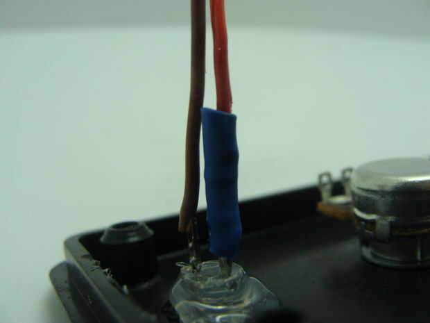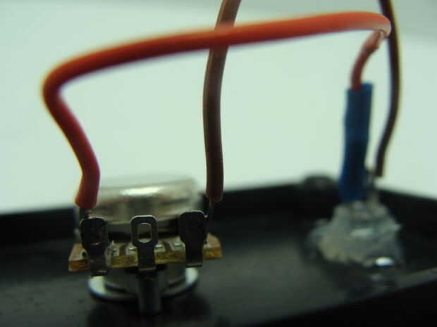 El conector de audio y el cable es capaz de llevar 3 señales diferentes señales a través de él. Utilizaremos 5V, GND y un pin analógico para el potenciómetro. Hay más de 3 pines en el conector de audio sin embargo. Usé mi multimetro para probar la continuidad enchufada 2 usando un cable de audio para ver que pines fueron los que use. También puede hacerlo si desea. Se puede ver en una de las fotos que pines del potenciómetro se conecta a. Yo entonces soldar 3 cables de colores en lugar de la toma de audio. Puedes ver las fotos para ver cómo debe hacerlo. El cable negro es GND, el cable rojo es 5V, y el cable verde será nuestro análogo hacia fuera desde el potenciómetro.