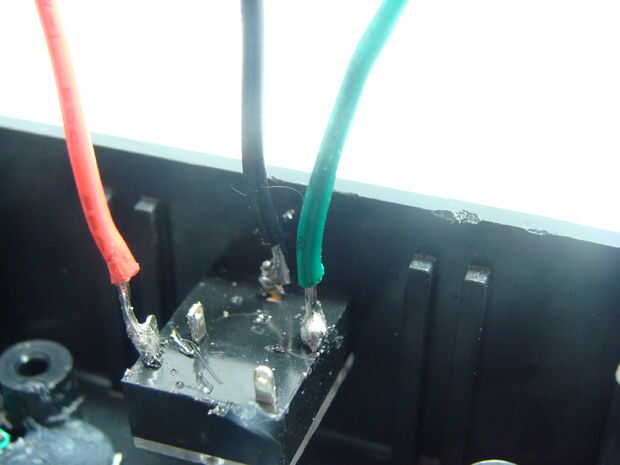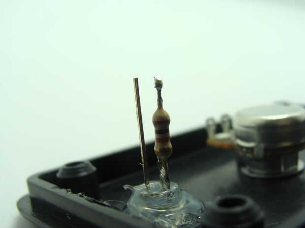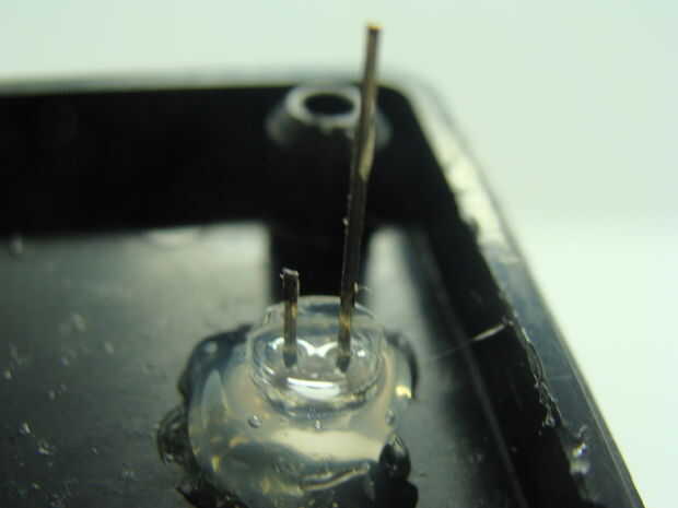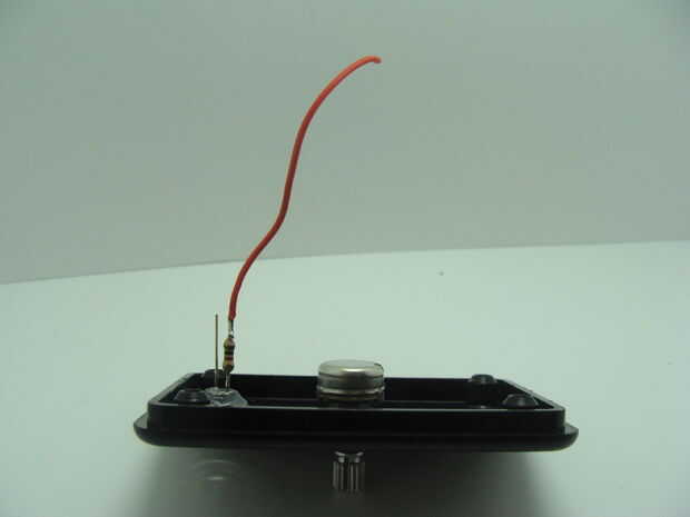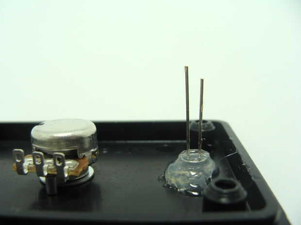 Luego, utilizando pegamento caliente, pegar el LED en su lugar. Pegué en ello un poco de lo LED se sobresale de la parte superior de la caja del proyecto. Ahora podemos empezar a conectar lo LED. El cable más largo en el LED es el pin de ánodo. He recortado este plomo abajo y había suelda el resistor de 1K a él. Un cable rojo recibe obtiene soldado al otro extremo de la resistencia de 1K. Use algunos de encogimiento de calor para cubrir esta conexión para evitar un cortocircuito los conductores del LED. Entonces acortar el otro cable (cátodo) del LED y soldar un cable negro a la misma. Soldar el cable rojo a uno de los pernos hacia fuera sobre el potenciómetro y suelde el cable negro al otro pin externo del potenciómetro. Se trata de cómo distribuimos energía. Finalmente se conectará el cable rojo a 5V positivo y negro tendrá una conexión con la tierra.