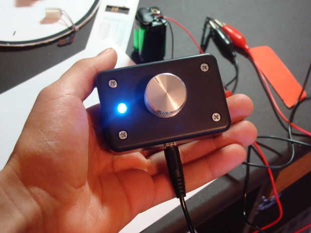 El primer paso es perforar algunos agujeros en la caja del proyecto. El tamaño de estos agujeros se quedarán a tu juicio, pero normalmente es bastante fácil de sostener algo hasta un pedacito de taladro y ver si es la correcta a utilizar o si necesitas un tamaño diferente. Un agujero debe ser perforado en el centro de la tapa para el potenciómetro de palillo a través. Otro agujero debe ser perforado en el centro del frente de la caja del proyecto para la toma de audio a perno en. Finalmente se perfora un agujero para el LED cerca del borde de la tapa. Sólo se utilizará este LED de indicación de energía.