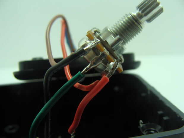 (Encontré esta parte viene a ser más fácil si usted Desatornillar el potenciómetro de la parte superior de la caja del proyecto) Finalmente soldar el cable negro de la conexión de audio con el conector externo del potenciómetro que soldamos el cable negro de la LED en. Así distribuirá GND. soldadura el cable rojo del conector de sonido con el conector externo del potenciómetro que se había suelda el cable del LED en rojo. Así distribuirá 5V. Luego soldar el cable verde a la patilla central del potenciómetro. Este es el análogo en el potenciómetro.