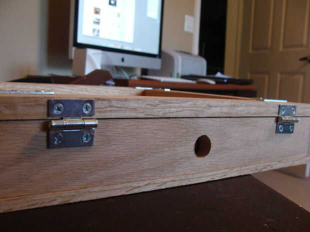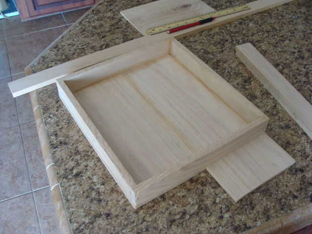 La parte inferior está hecha con 2 5.5" amplia tiras de madera dura que son. 25" de espesor. Los lados son del mismo tipo de madera. Estas piezas de madera son de 1.5" de ancho y 7/16" de espesor. Para que nada complicado, sólo hacen una caja con pegamento, clavos y un martillo. Hay algunos agujeros en la caja que voy a explicar en el siguiente paso.
