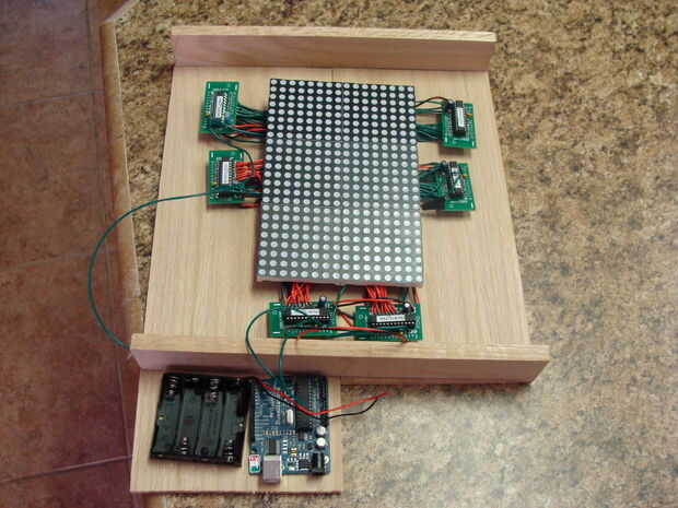 Mi concepto básico era algo lo suficientemente grande como para caber la pantalla y electrónica. Decidí que sería bueno tener el Arduino y pilas en el exterior para poder programar fácilmente y cambiar las baterías. Así que salí de una repisa en el exterior de la caja para estos artículos.
